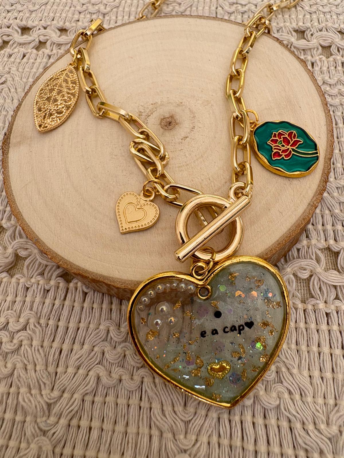 Un pezzo unico, realizzato interamente a mano. Il ciondolo in resina, con una composizione interna di foglie d'oro, delicate perle e glitter finissimi che riflettono la luce.