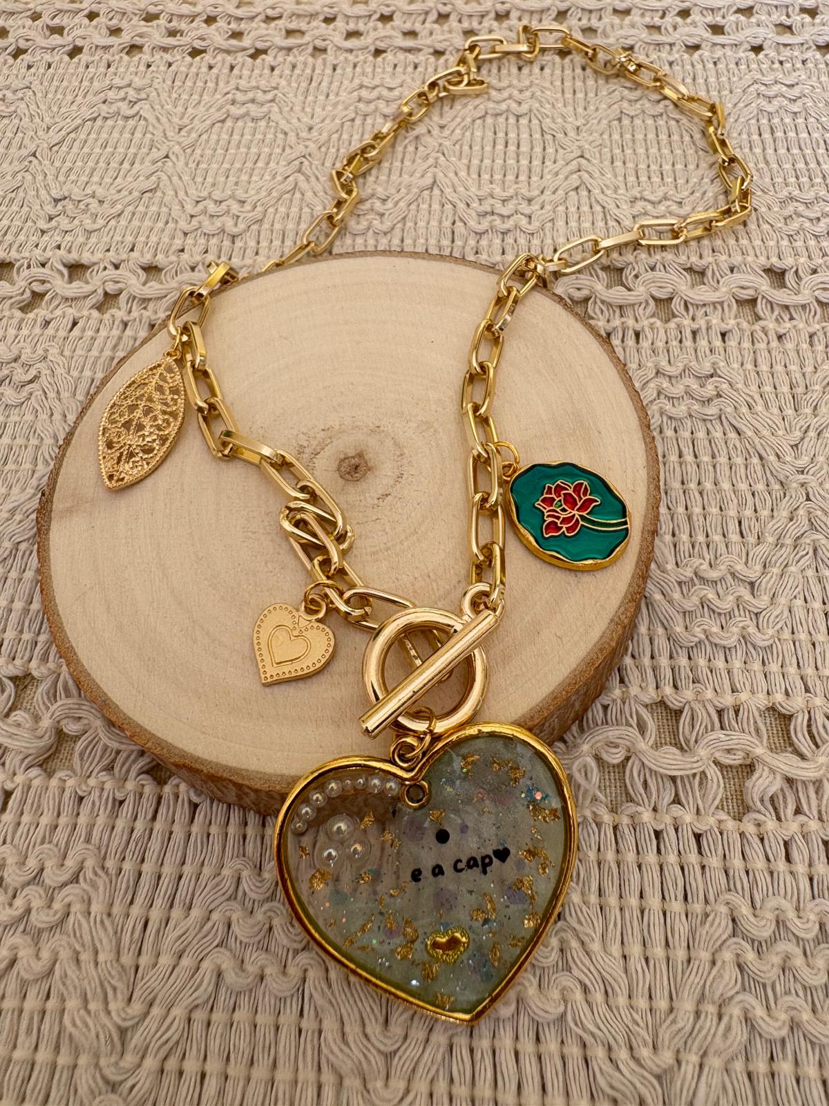 Ciondolo: Resina epossidica, foglie d'oro, perle sintetiche, glitter.