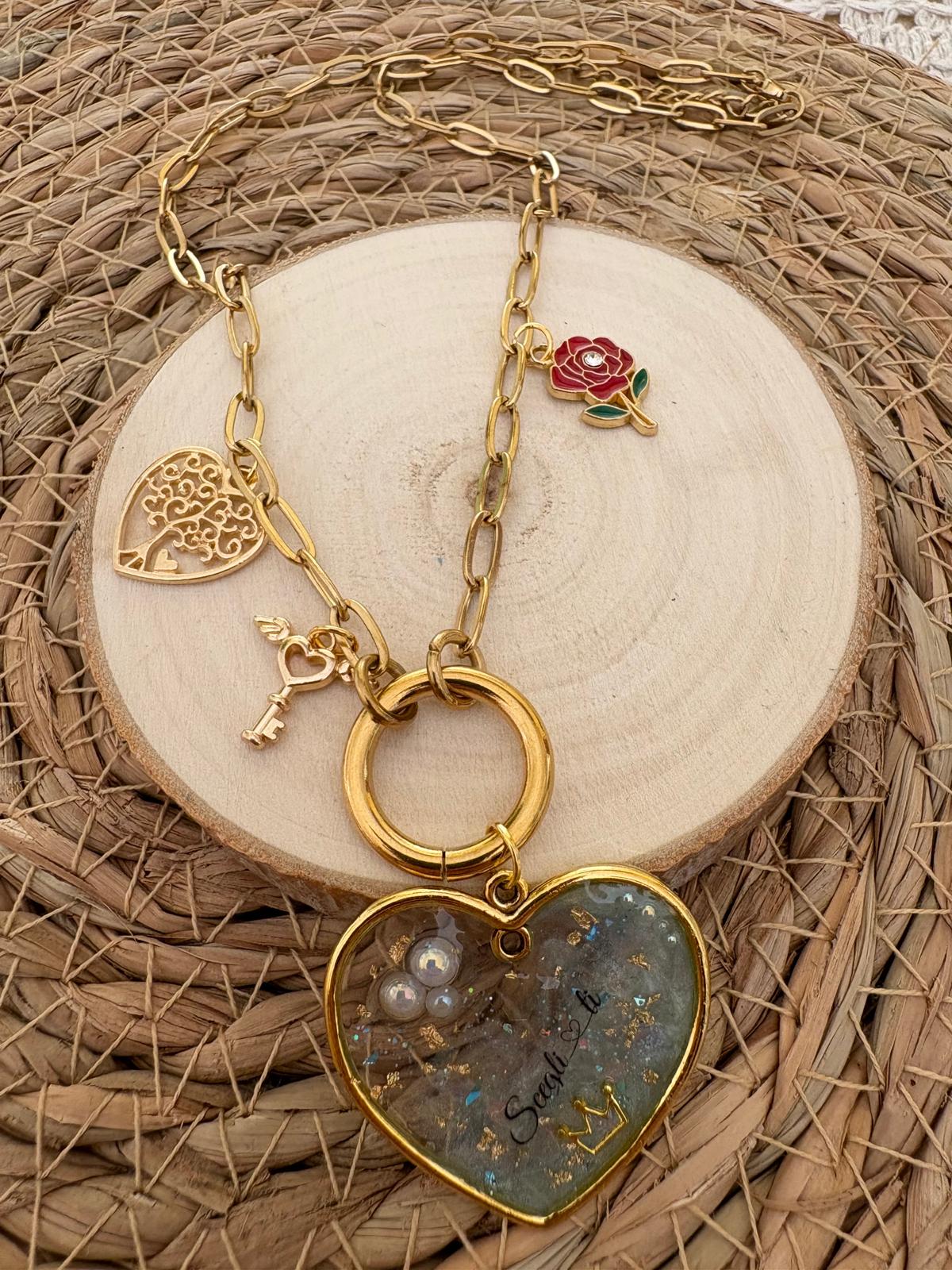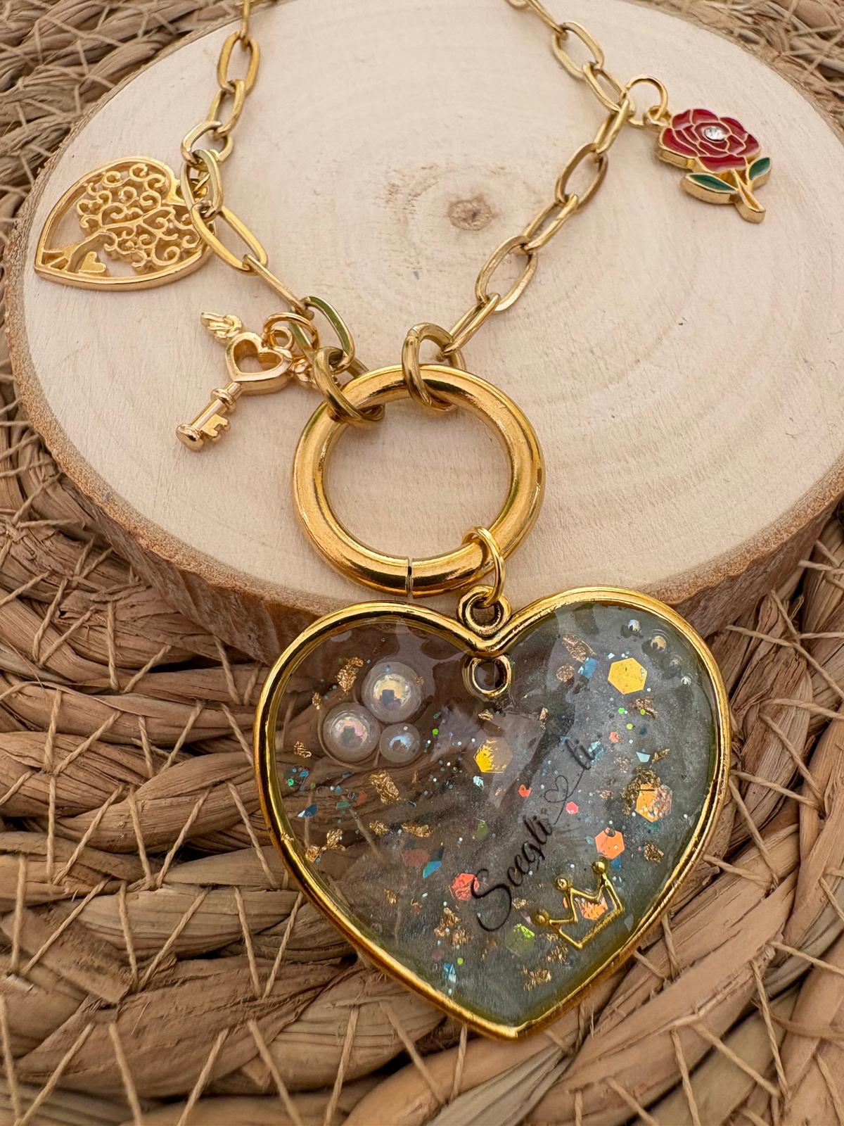 Un pezzo unico, realizzato interamente a mano. Il ciondolo in resina, con una composizione interna di foglie d'oro, delicate perle e glitter finissimi che riflettono la luce.